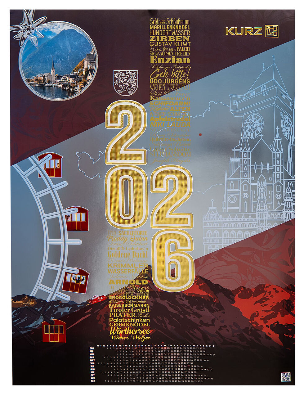 Für den neuen LEONHARD KURZ Wandkalender 2026 haben wir die ganze Vielfalt der Alpenrepublik in Szene gesetzt: das berühmte Wiener Riesenrad, die majestätischen Alpen, ein malerischer Blick auf Hallstatt, dazu besondere Akzente wie ein Edelweiß, das Wappen der Stadt Steyr, weitere bekannte Wahrzeichen Österreichs und vieles mehr.