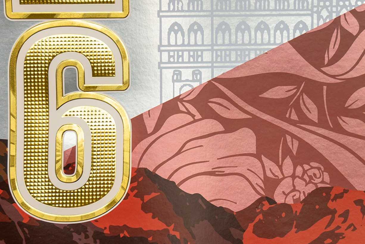 Mit LUXOR® 385 MTS im Heißprägeverfahren bringen wir feinste Strukturen ins Spiel: Die Gondelrahmen werden in Szene gesetzt, und die Jahreszahl kommt effektvoll zur Geltung. Ein Konturrand mit Microembossing verleiht ihr zusätzlich Eleganz. Das KURZ-Logo steht als erhabenes Relief oben rechts und präsentiert sich so als starkes Markenstatement.