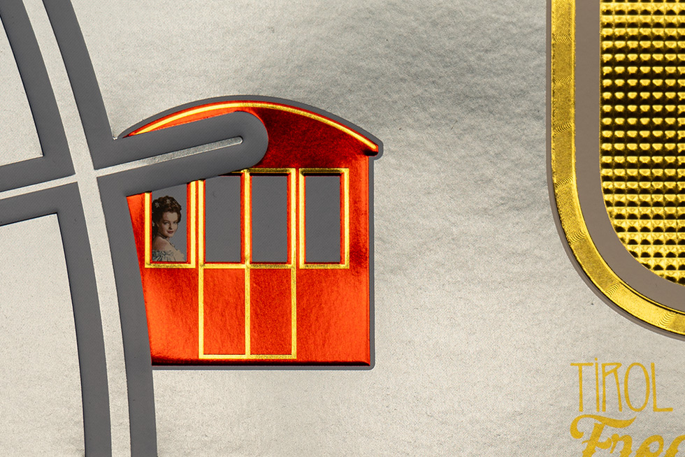 Das Wiener Riesenrad mit seinen Gondeln erhält heißgeprägte Akzente mit LUXOR® 392 MTS. Die zweistufige Prägung lässt die Gondeln vor dem Alpenpanorama schweben.