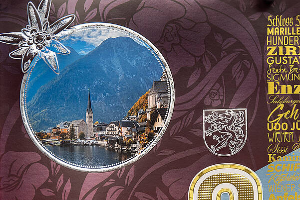 Mit SILVER LINE® Sails setzen wir glänzende Highlights im Heißprägeverfahren. Edelweiß, Wappen und der kreisrunde Blick auf Hallstatt werden zusätzlich blind geprägt – so heben sich die Elemente mit edlen Nuancen hervor und entfalten eine fühlbare Tiefe.