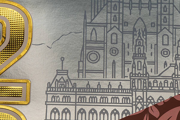 Mit LUXOR® 385 MTS im Heißprägeverfahren bringen wir feinste Strukturen ins Spiel: Die Gondelrahmen werden in Szene gesetzt, und die Jahreszahl kommt effektvoll zur Geltung. Ein Konturrand mit Microembossing verleiht ihr zusätzlich Eleganz. Das KURZ-Logo steht als erhabenes Relief oben rechts und präsentiert sich so als starkes Markenstatement.