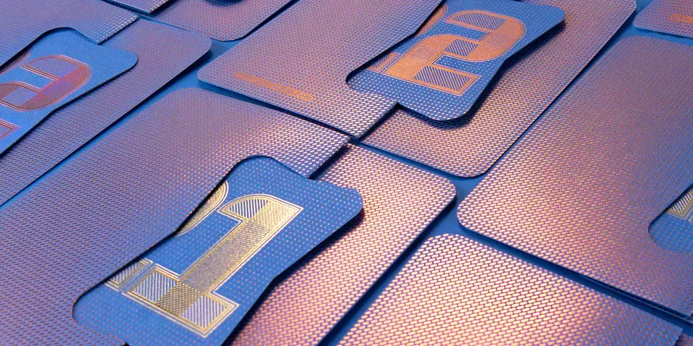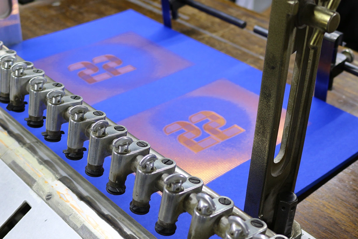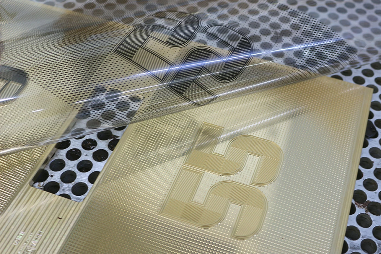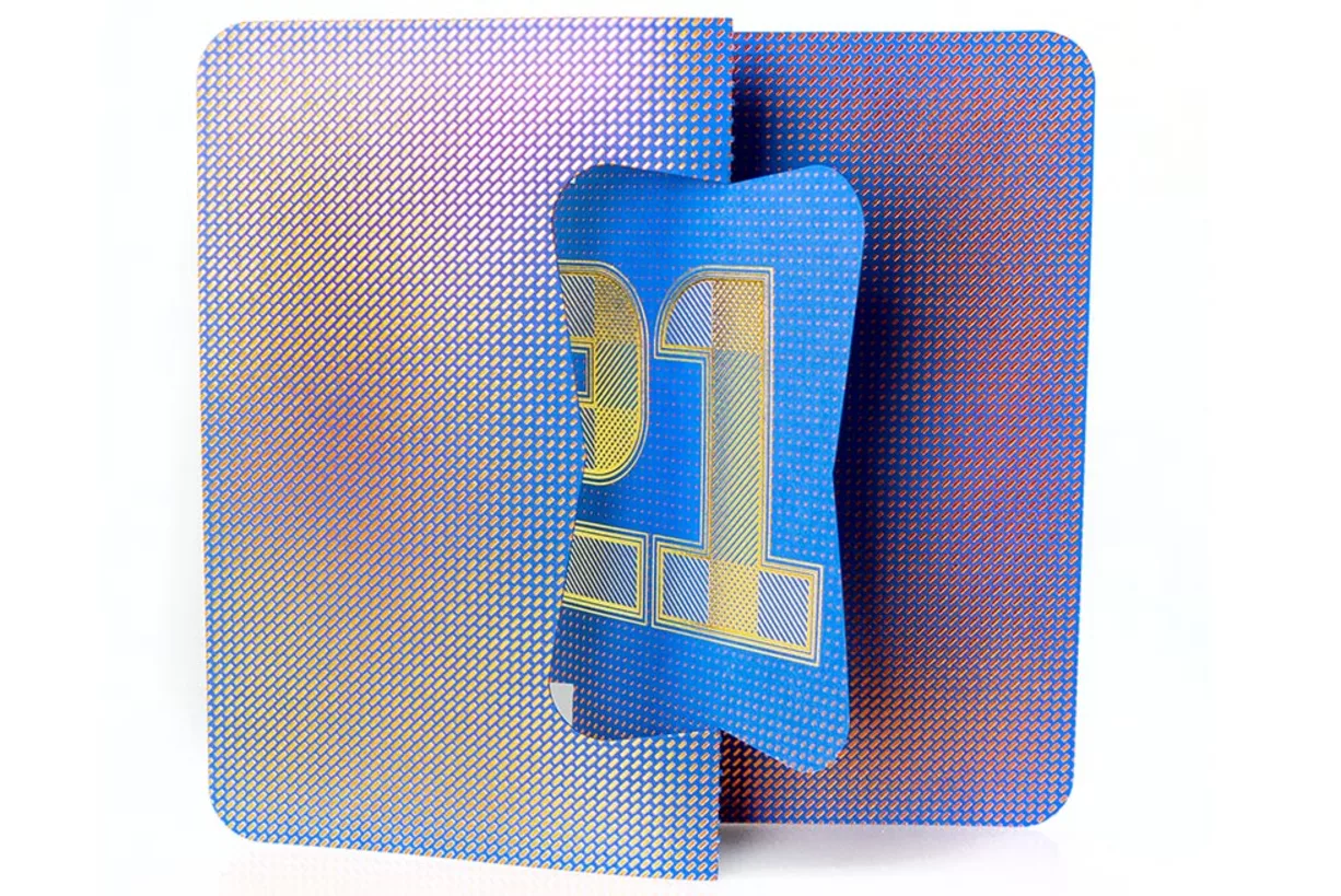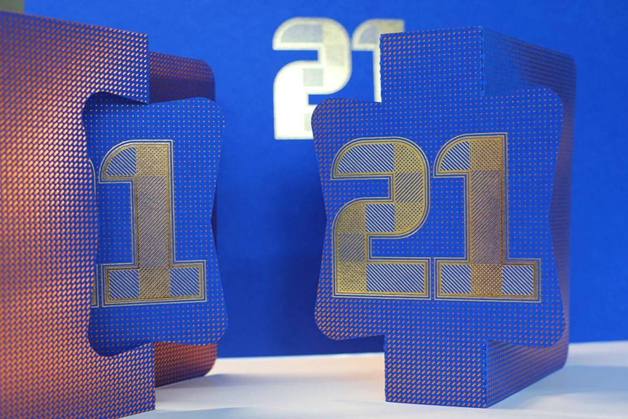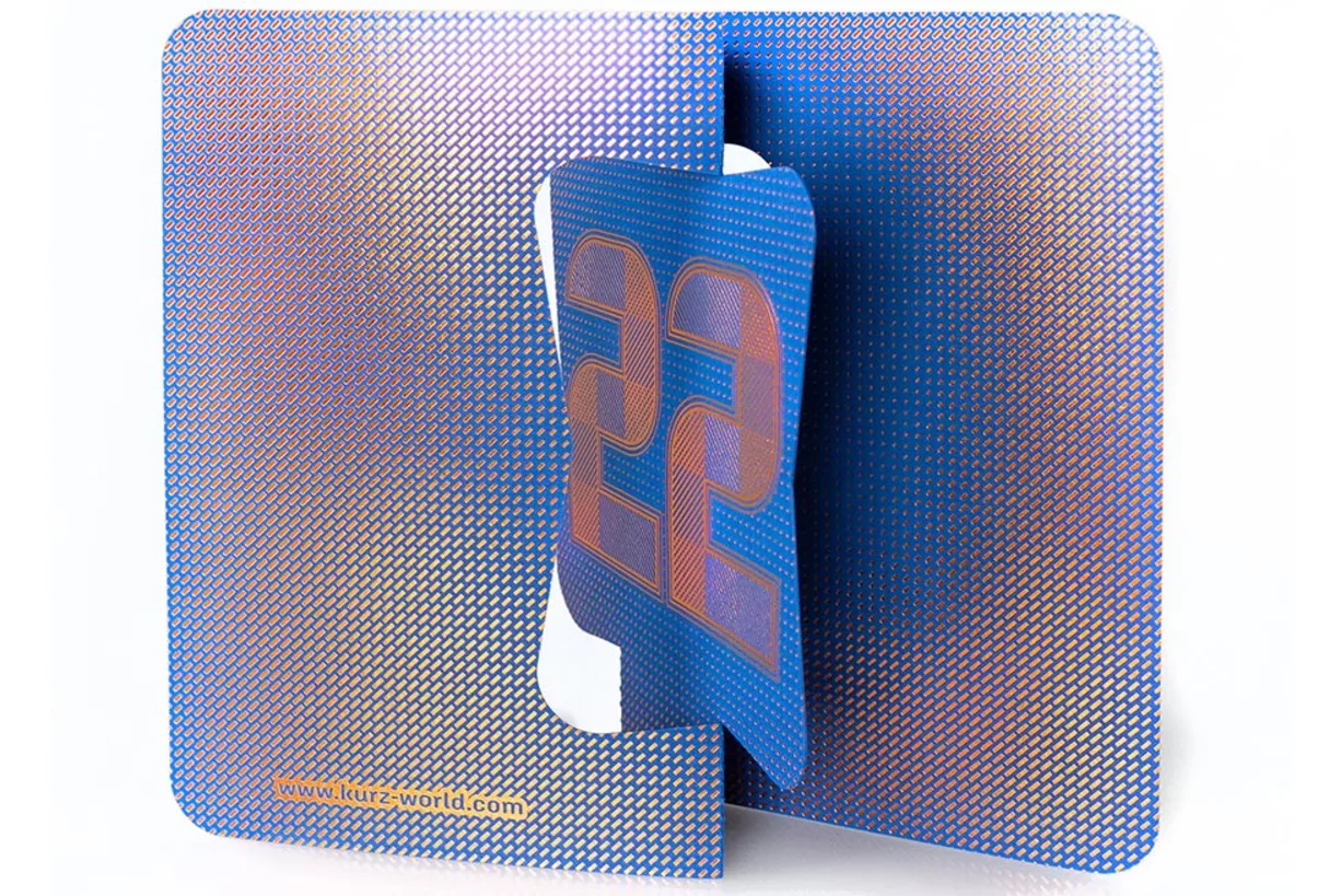 Sowohl den Jahreszahlen „21" und „22" als auch dem Hintergrundraster wurden durch unsere Heißprägetechnologie eine besondere Optik und Haptik verliehen. Für den edlen Touch setzten wir auf unsere Transferveredelungen LUXOR® 385 und LUXOR® 396.