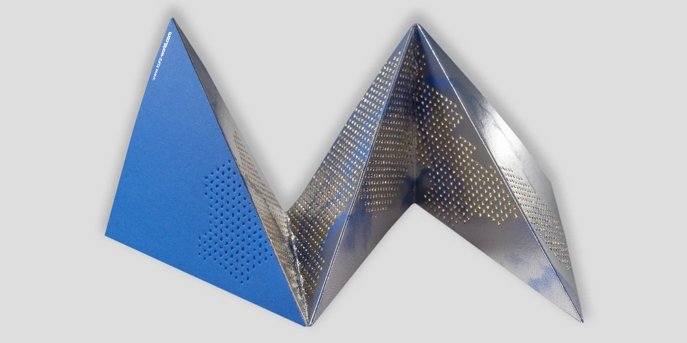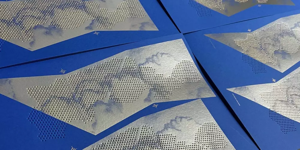 Die silbernen Flächen, die im Entwurf vorgesehen waren, wurden in eine metallische Struktur verwandelt, die durch Wolkenmuster aufgebrochen wird. Kontrastierend zur geometrischen Prägung wurde ein frequenzmoduliertes Zufallsmuster eingearbeitet, das den Wolken nachempfunden ist. Die Veredelung des blauen, durchgefärbten Gmund Colors Natur-Kartons (300g/m² GMUND Colors matt Farbton 55) wurde mit DT-H Cold Silver anhand einer DIGITAL METAL®-Applikation umgesetzt. Die Flachprägung wurde umgesetzt mit LUXOR® 420 und im letzten Schritt blind tiefgeprägt.