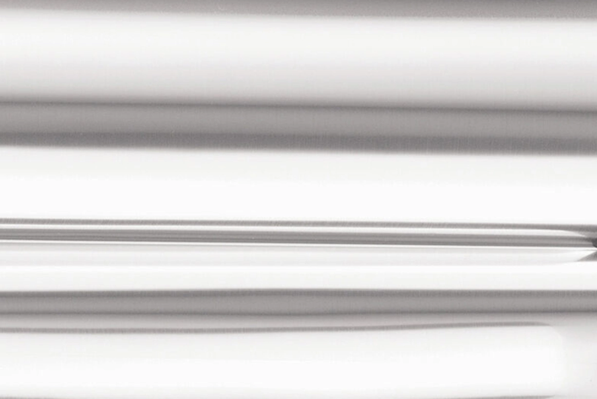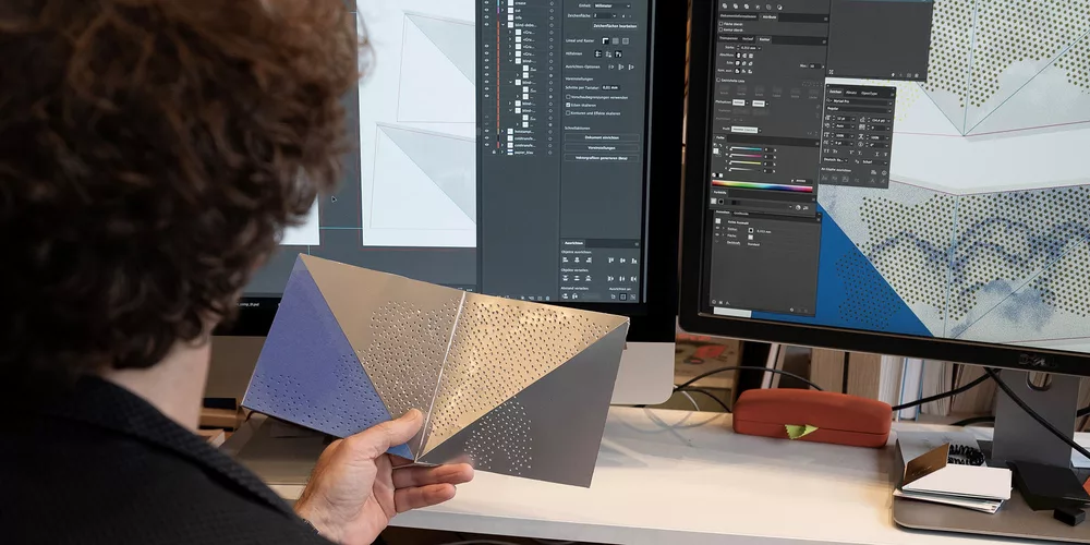 Der Ausgangspunkt war Michls Konzept, das bereits markante manuelle Strukturen enthielt, die mit Hammer und Nagel auf silberbeschichtetem Karton entstanden. Dieses rohe, handwerkliche Element diente als Inspiration für die Prägungen der Karte. Ziel war es, die Belastungsgrenzen des Materials auszureizen, sodass gewollte Durchbrüche und Risse entstehen. Diese spontane, unvorhersehbare Struktur verleiht der Karte ihre einzigartige Haptik und unterstreicht die handwerkliche Seite des kreativen Prozesses. Verantwortlich dafür zeigt sich unser Tochterunternehmen Hinderer + Mühlich, das eine breite Produktpalette an Stempeln, Prägerädern sowie Prägezubehör bietet.