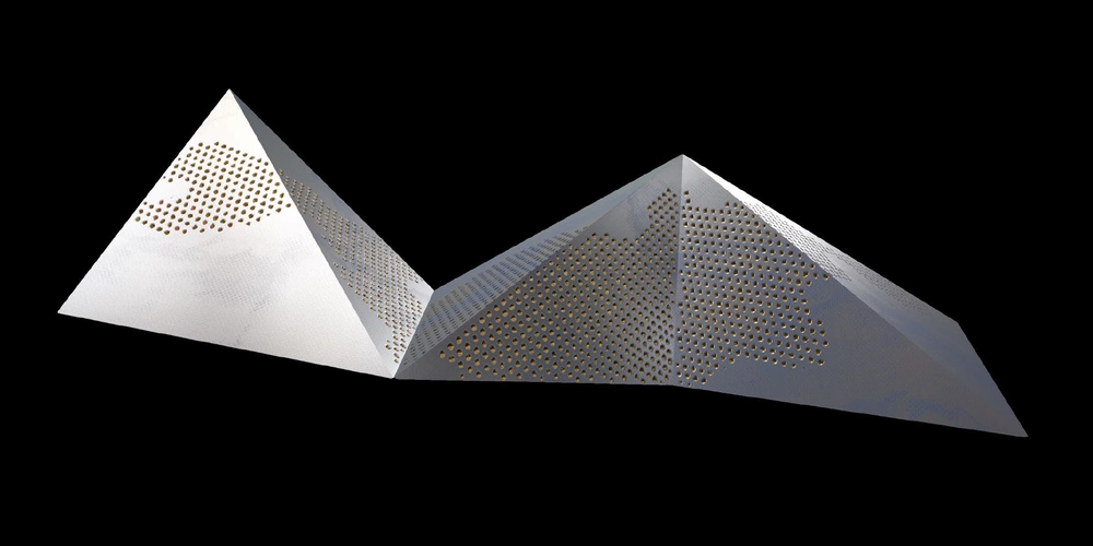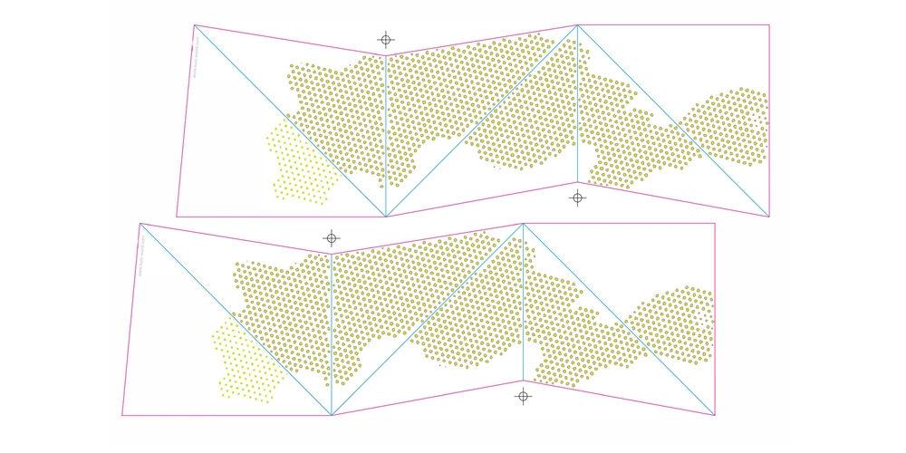 Die Rohheit der Vertiefungen, die blauen Flächen und die strenge Geometrie inspirierten uns bei der Materialwahl, der Veredelung und der Prägungen dazu, den Rahmen der normalerweise einzuhaltenden Grenzen der Belastbarkeit von Karton zu sprengen und das Material zu brechen und teils aufreißen, um dem manuellen handwerklichen Schaffensprozess im industriellen Maßstab nahezukommen. Das Ergebnis wirkt so beeindruckend klar in seiner geometrischen Formensprache, so ansprechend und einfach, dass sich der Betrachter über die Herausforderungen bei der Herstellung zunächst keine Gedanken macht.
